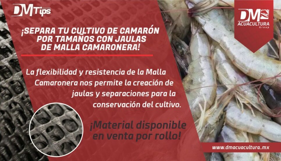 - La Malla Camaronera de uso acuícola nos ayuda a separar distintos tamaños de camarón, pues esto es requerido para que las especies más grandes no se alimenten de las más chicas.